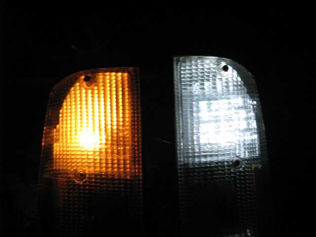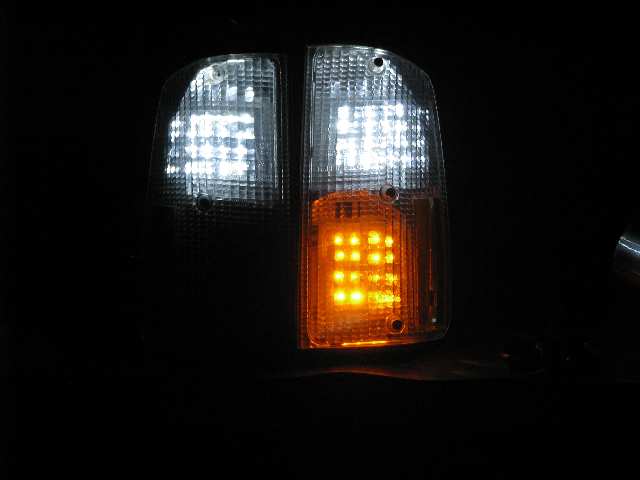 Ad1: Ik heb ijscodekseltjes genomen, veel gaatjes geprikt en er 24 ledjes opgepropt, voor het geheel 1 weerstand van 100Ohm en 2 diodes gemonteerd. Lampvoet komt van kapotte 21/5 lampen waarvan het buitenglas met een waterpomptang prima breekt ! Het binnenglas heb ik laten zitten omdat het op die aansluitingen makkelijk solderen is...